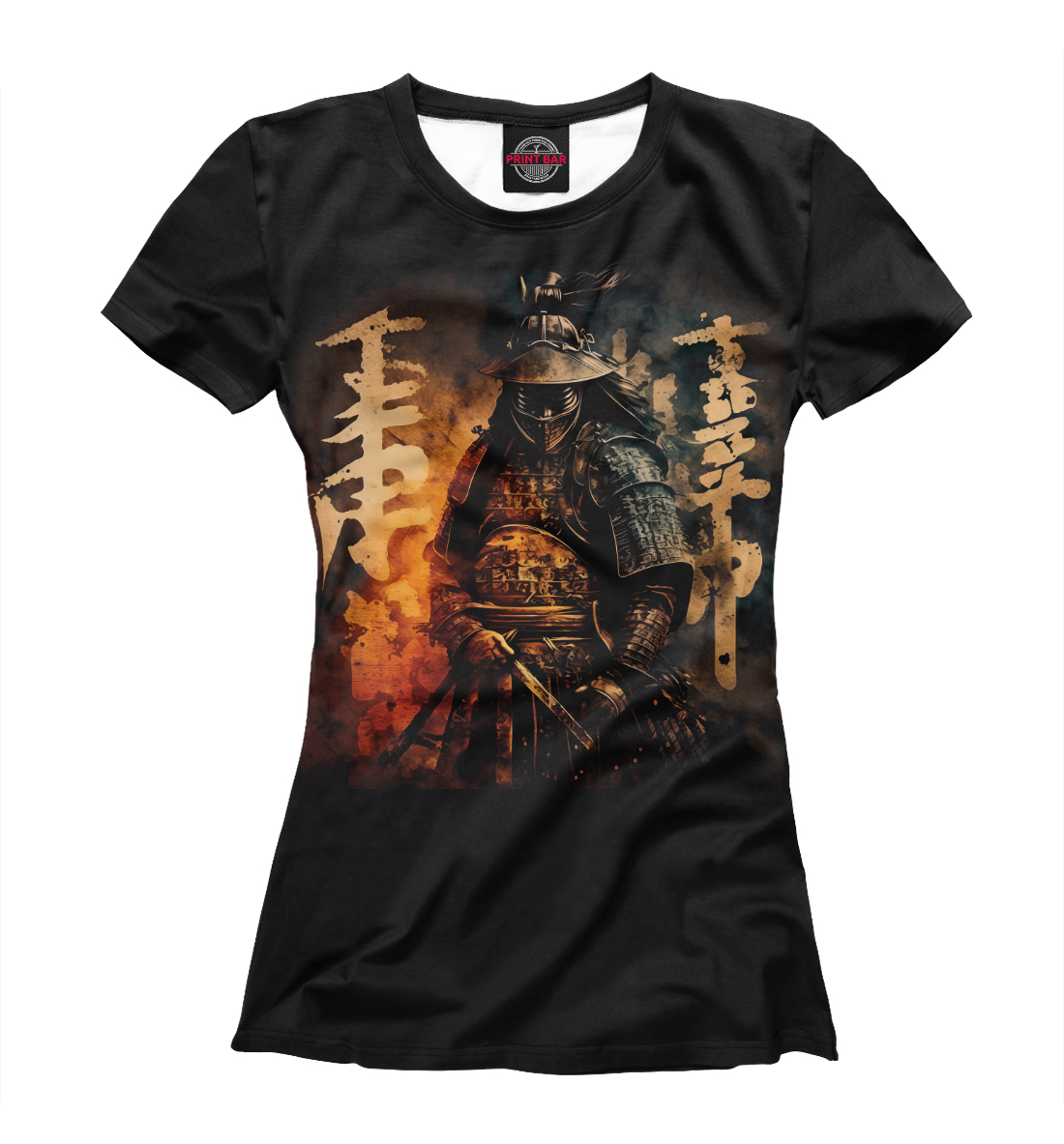 Детская футболка для девочки с принтом «Самурай и иероглифы на огненном фоне»