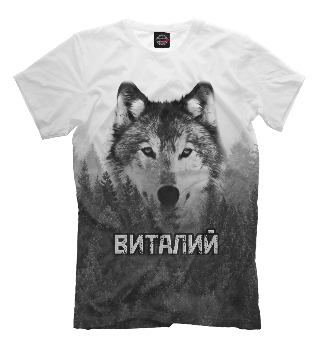 Мужская футболка с принтом «Волк над лесом - Виталий»
