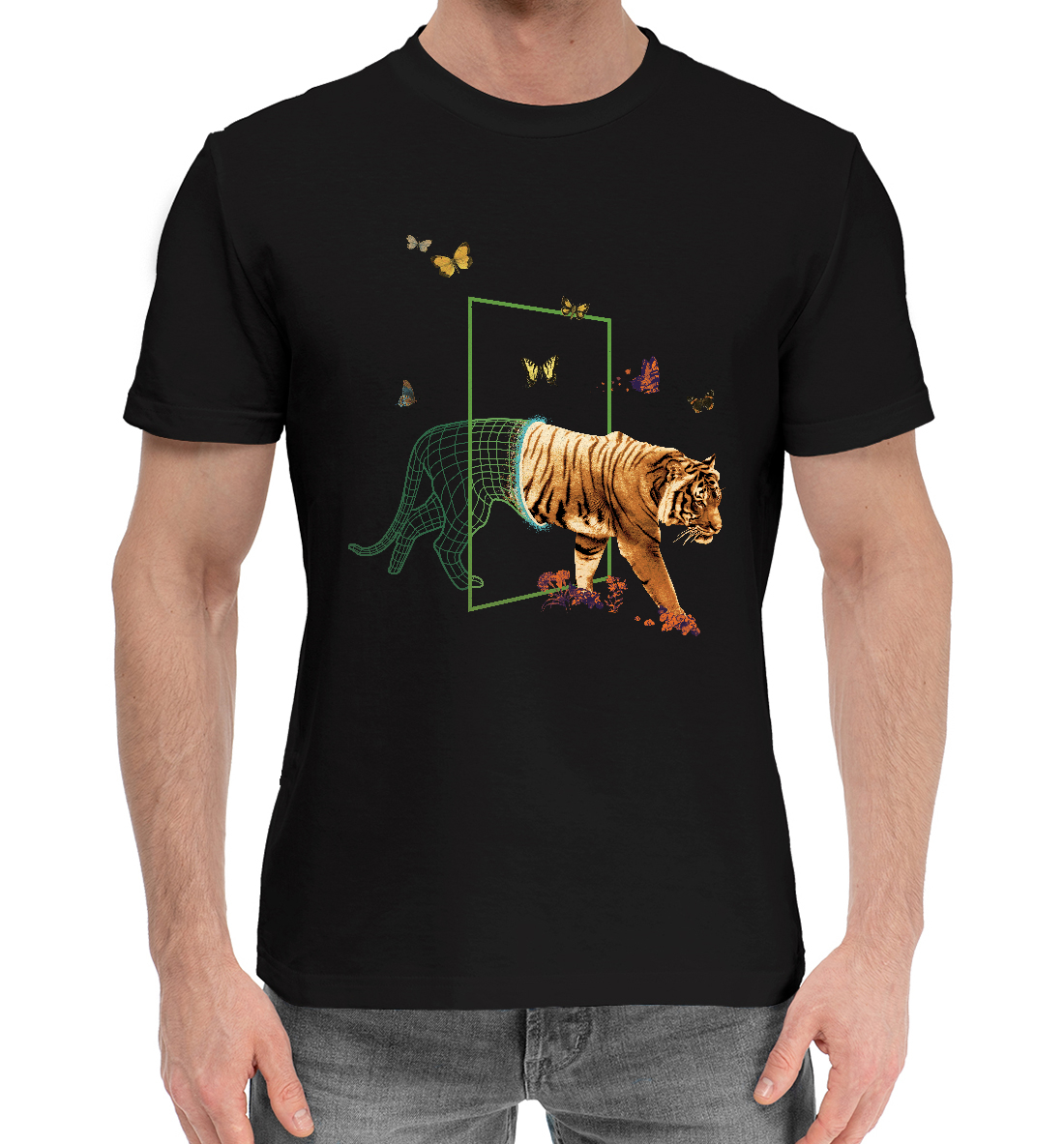 Мужская хлопковая футболка с принтом «Акварельный Тигр - Коллаж»