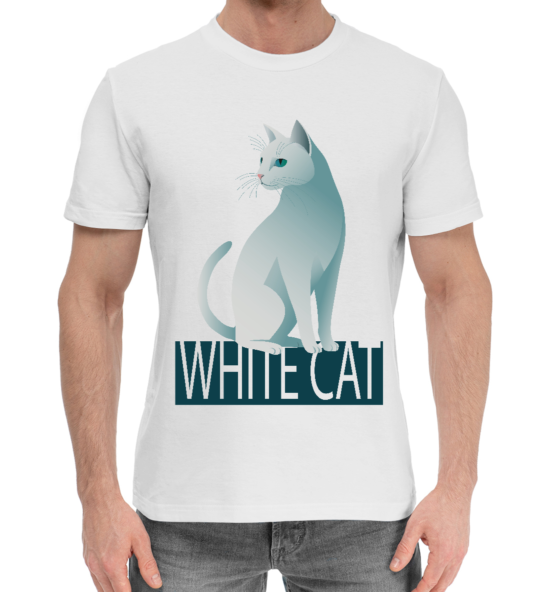 Мужская хлопковая футболка с принтом «Белый кот сидит на надписи белый кот»