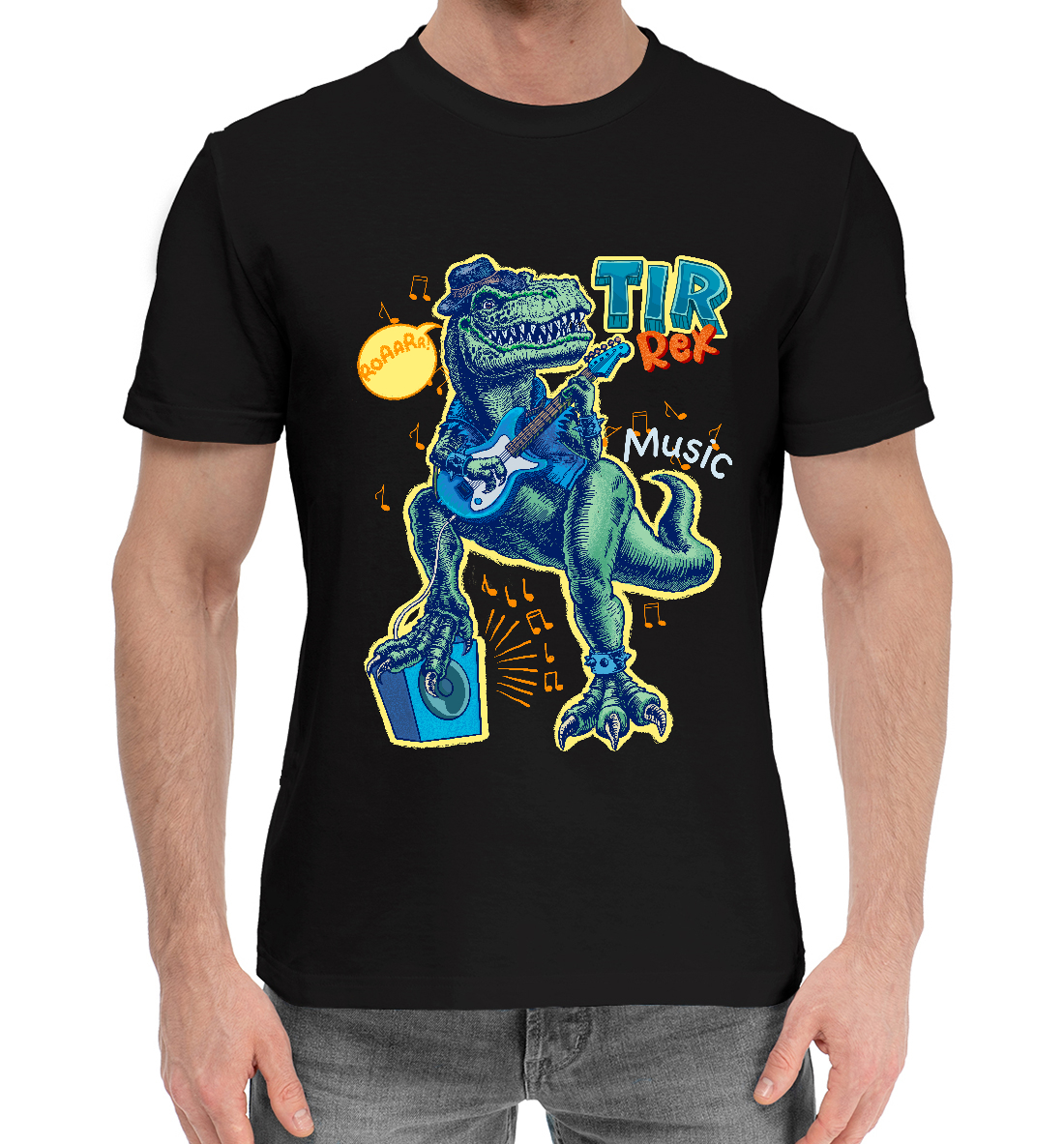 Мужская хлопковая футболка с принтом «Динозавр играет на гитаре»