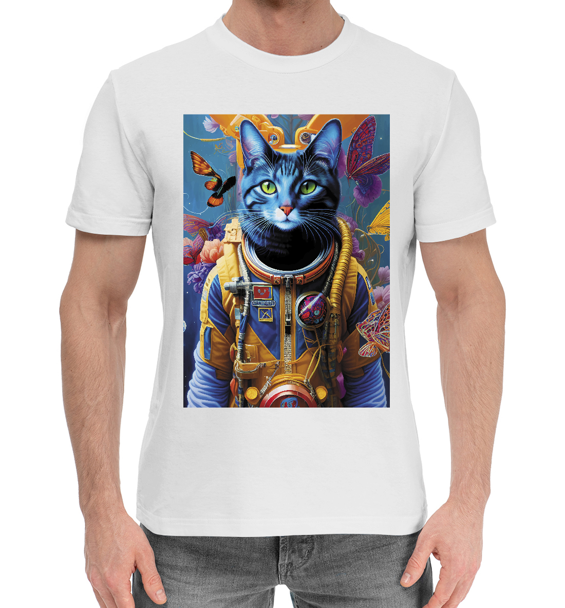 Мужская хлопковая футболка с принтом «Котик бравый космонавт»