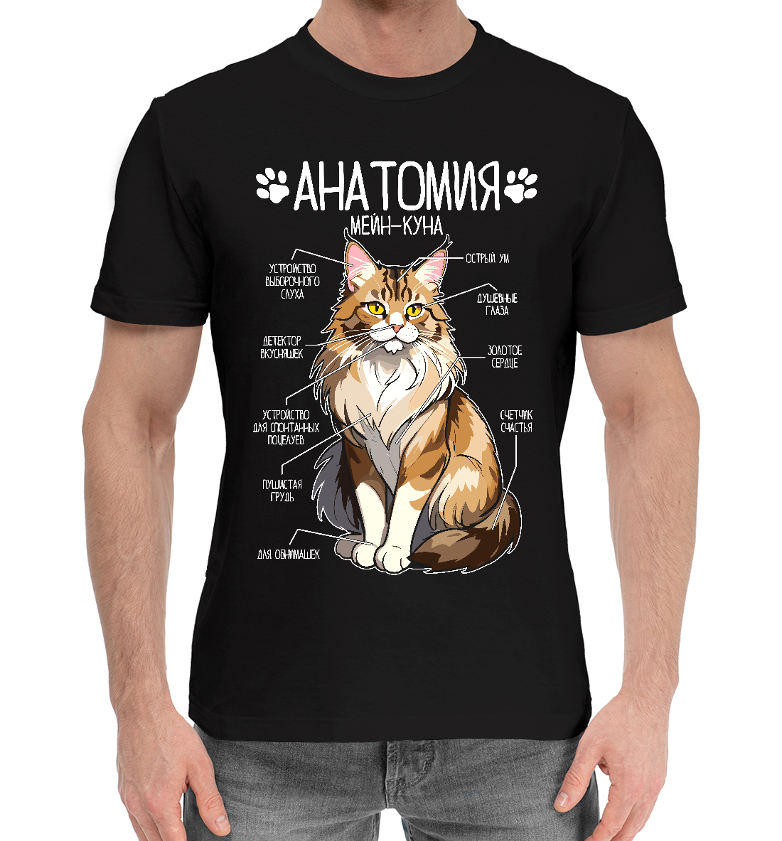 Мужская хлопковая футболка с принтом «Мейн-кун анатомия (черный фон)»