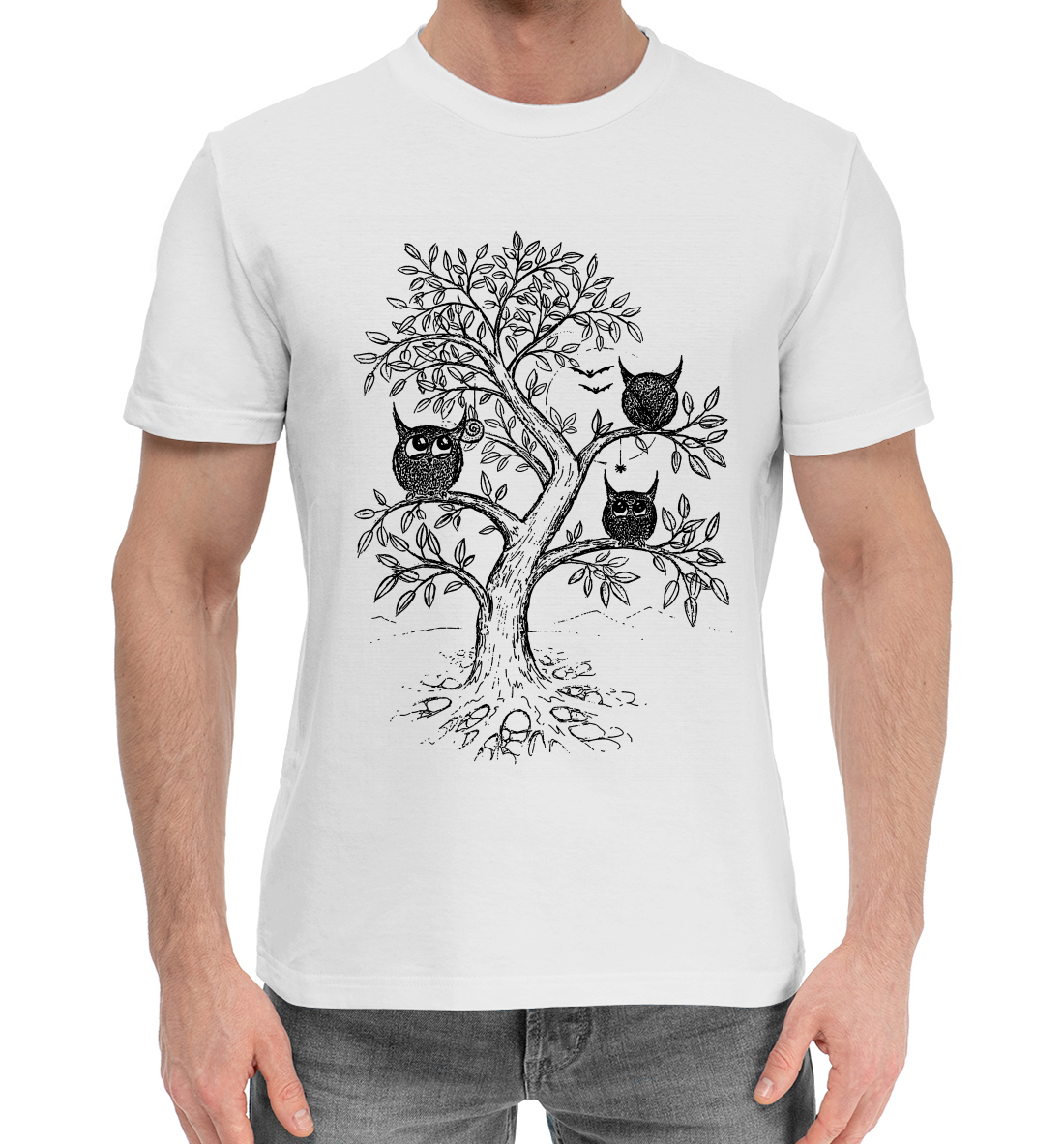 Мужская хлопковая футболка с принтом «Совята на дереве»