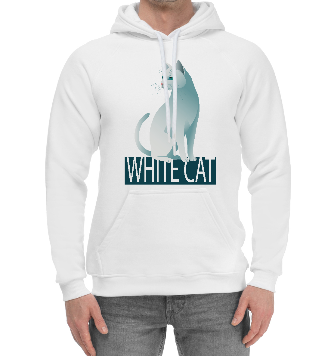 Мужской хлопковый худи с принтом «Белый кот сидит на надписи белый кот»