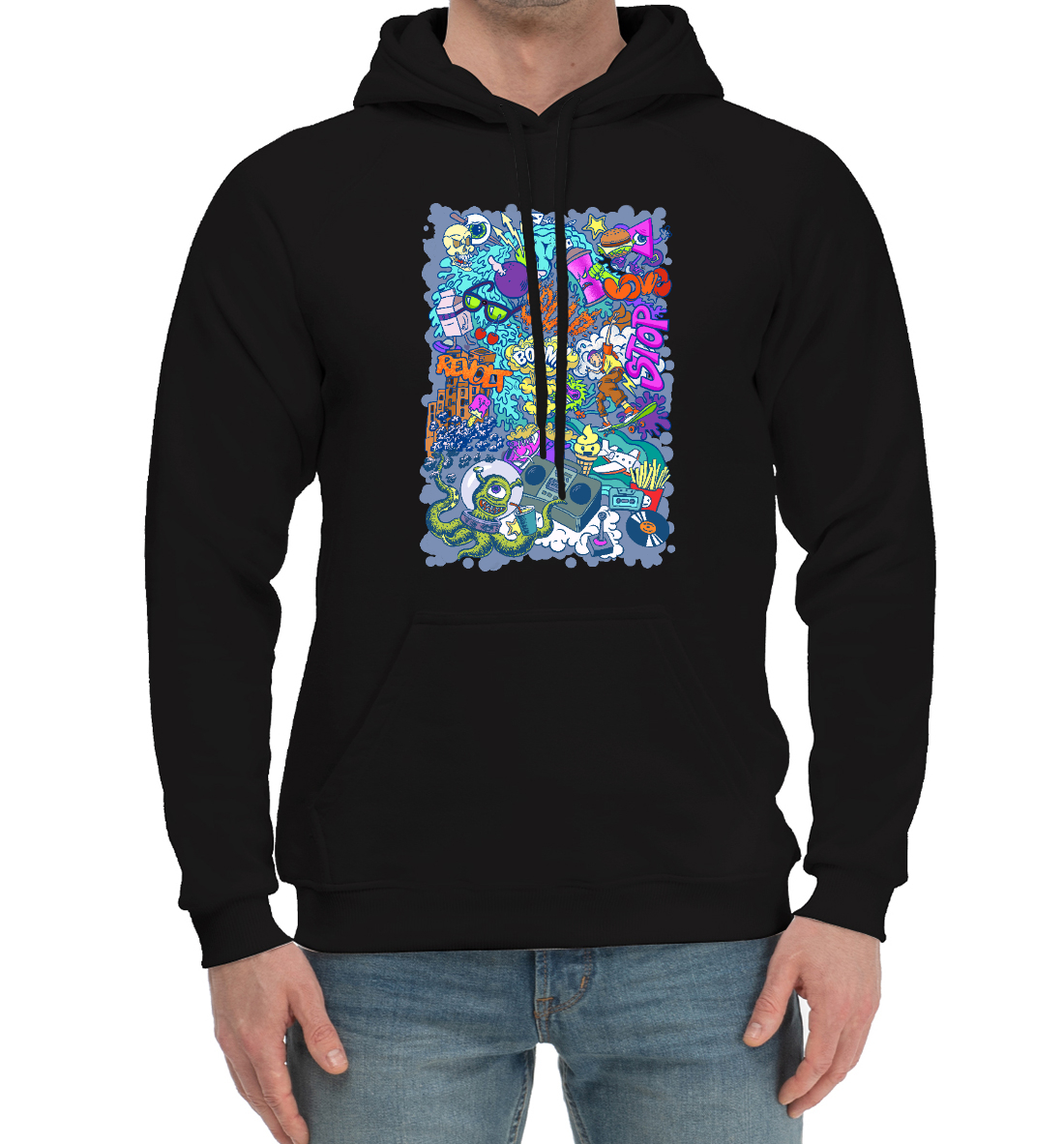 Мужской хлопковый худи с принтом «Граффити с инопланетянином на синем фоне»