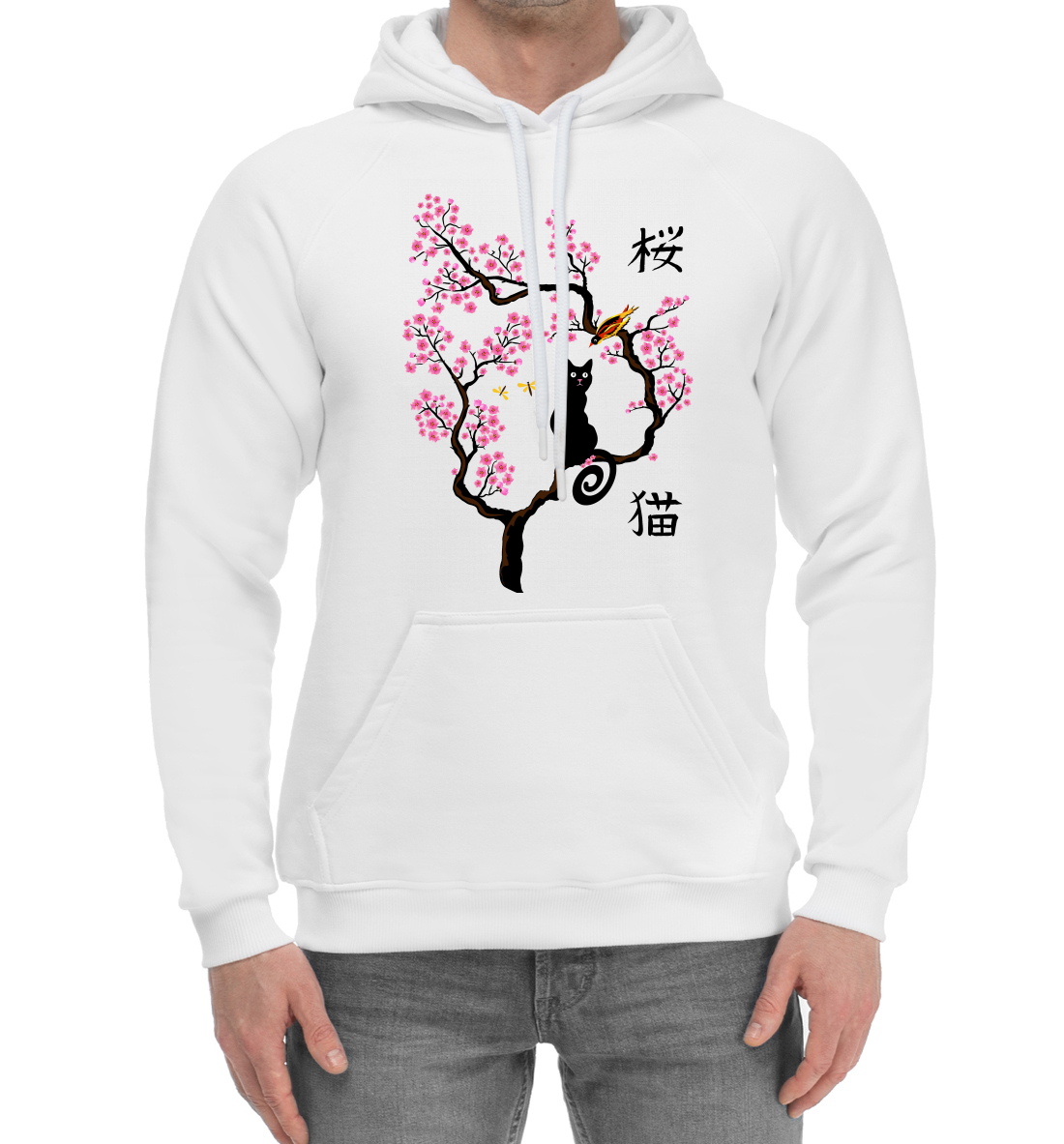 Мужской хлопковый худи с принтом «Кошка и птица на сакуре»