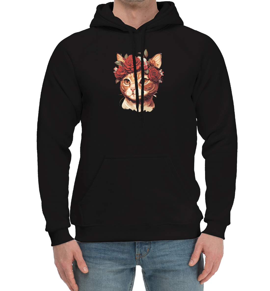 Мужской хлопковый худи с принтом «Кошка с цветами»