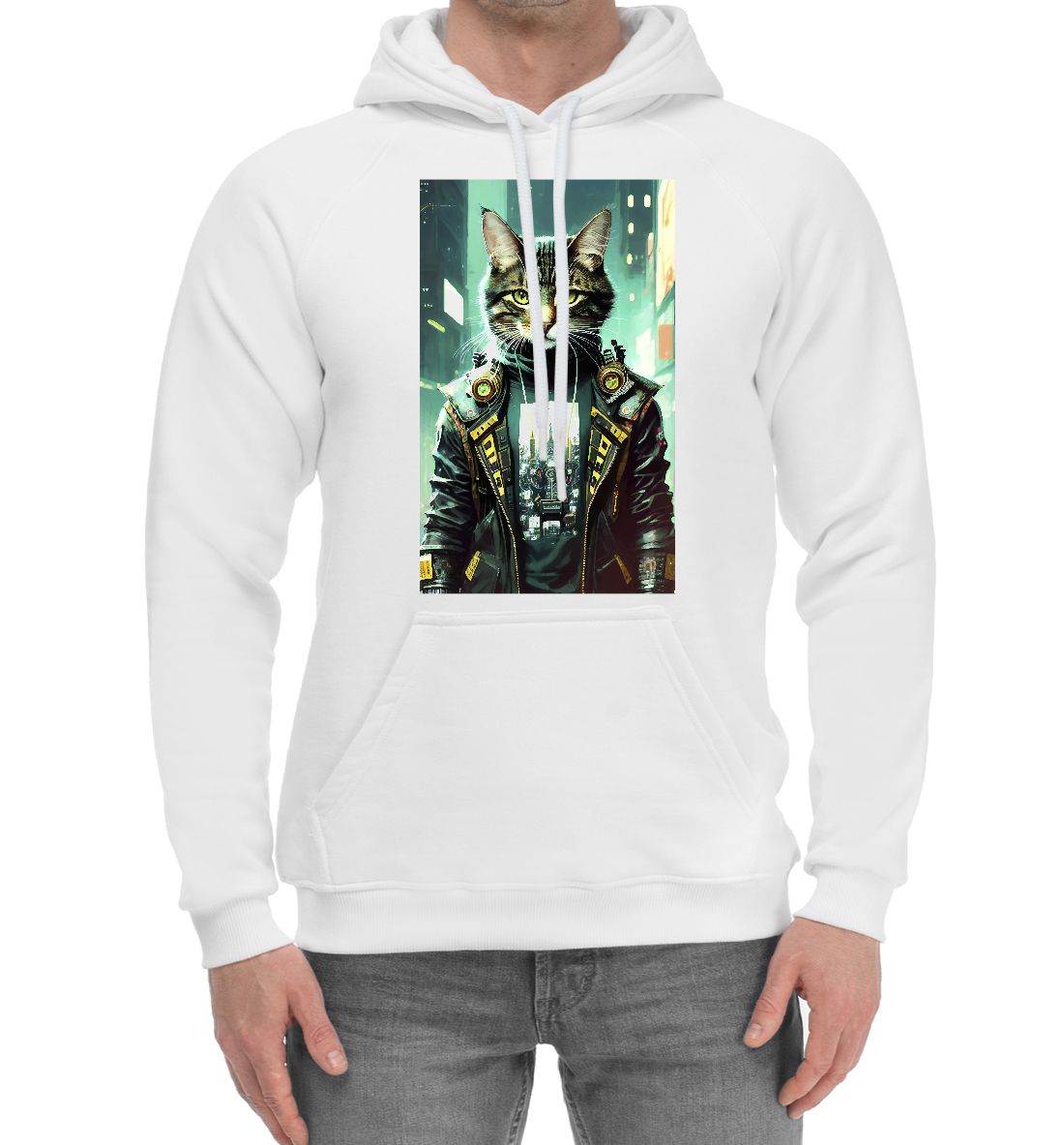 Мужской хлопковый худи с принтом «Крутой котяра на фоне высоток»