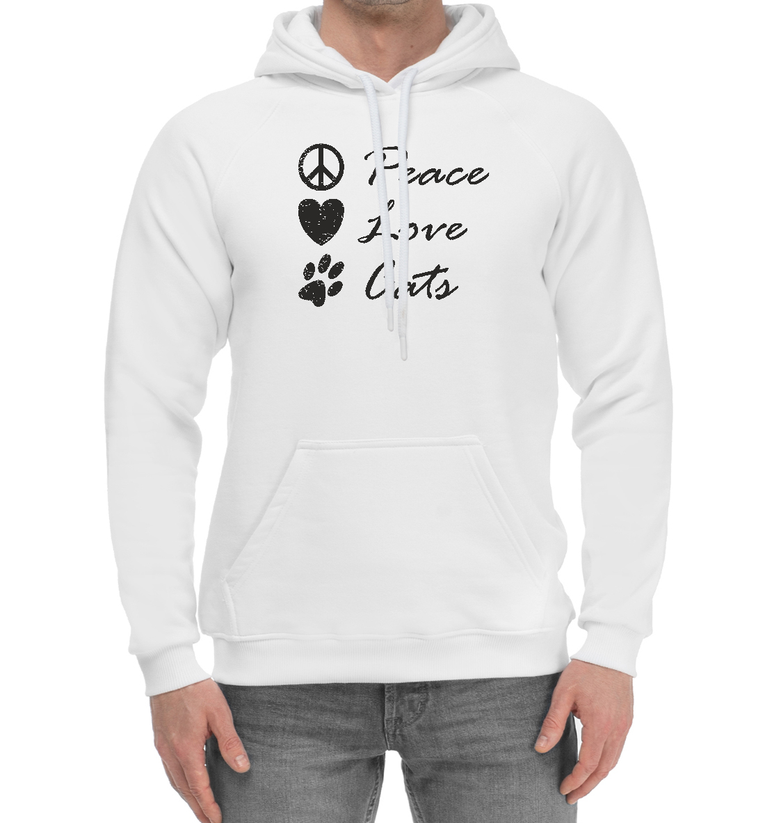 Мужской хлопковый худи с принтом «Мир, Любовь, Котики»