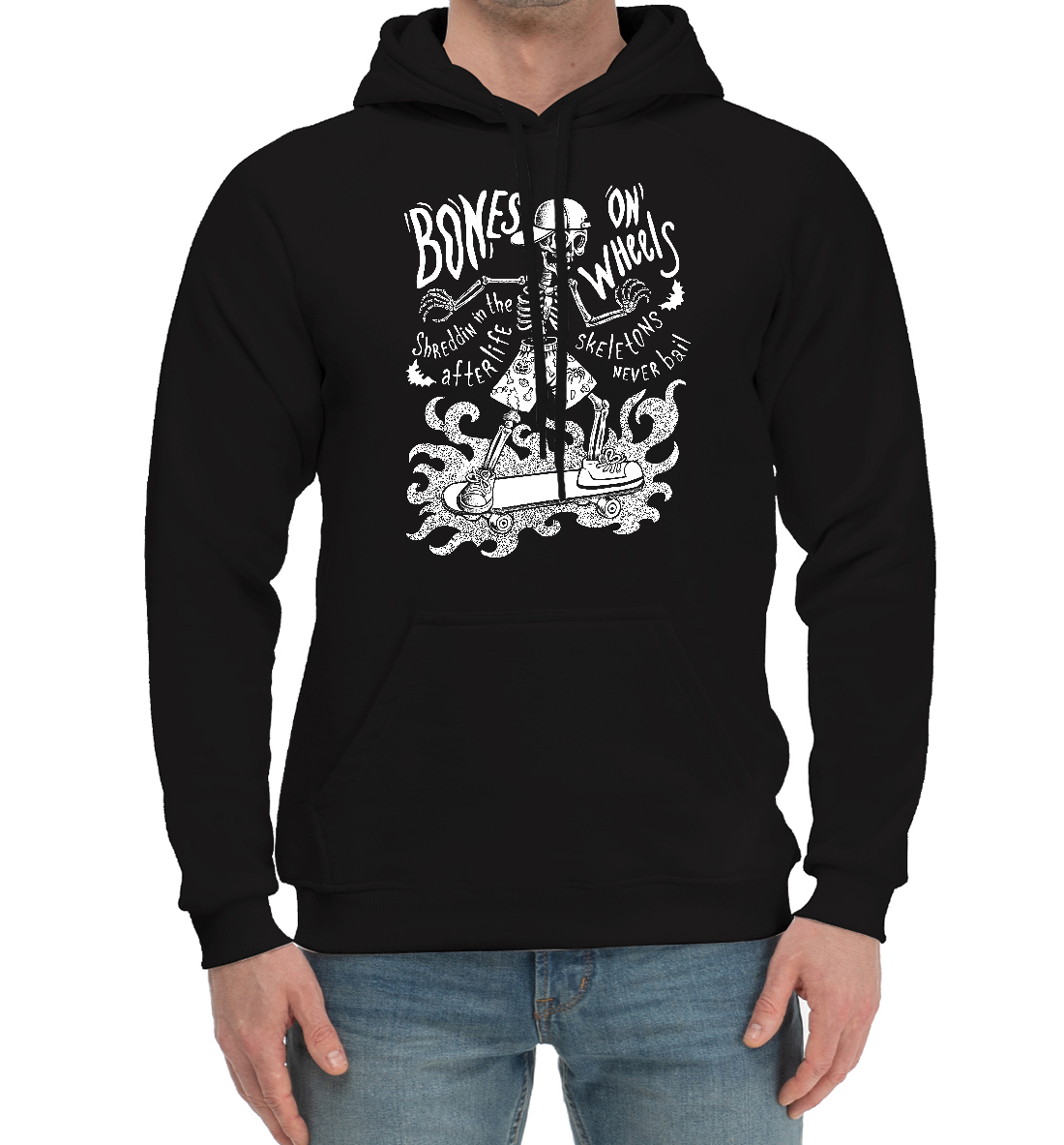 Мужской хлопковый худи с принтом «Скелет черно-белый на скейтборде»