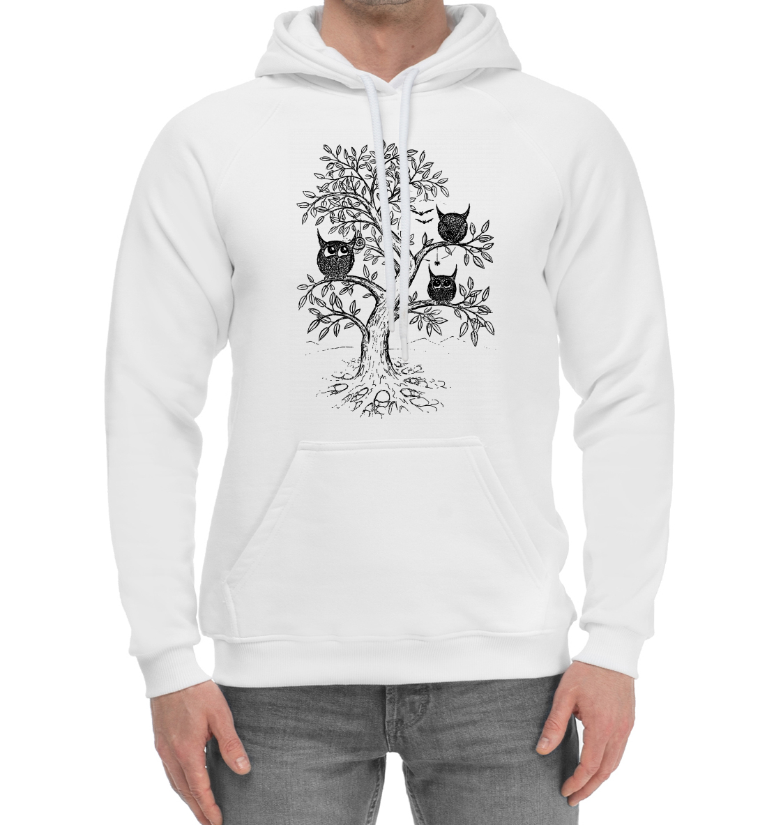 Мужской хлопковый худи с принтом «Совята на дереве»