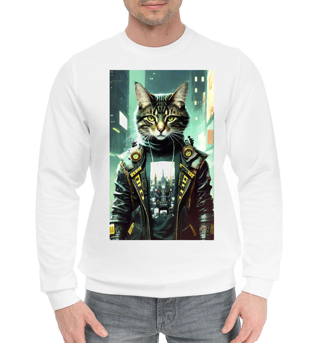 Мужской хлопковый свитшот с принтом «Крутой котяра на фоне высоток»