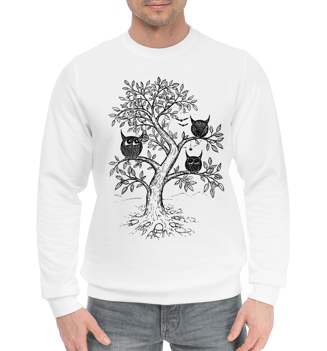 Мужской хлопковый свитшот с принтом «Совята на дереве»
