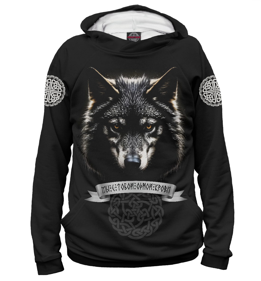 Мужское худи с принтом «Чёрный волк - мы с тобой одной крови»