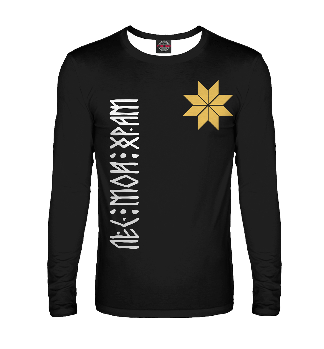 Мужской лонгслив с принтом «Алатырь - лес мой храм на чёрном фоне»