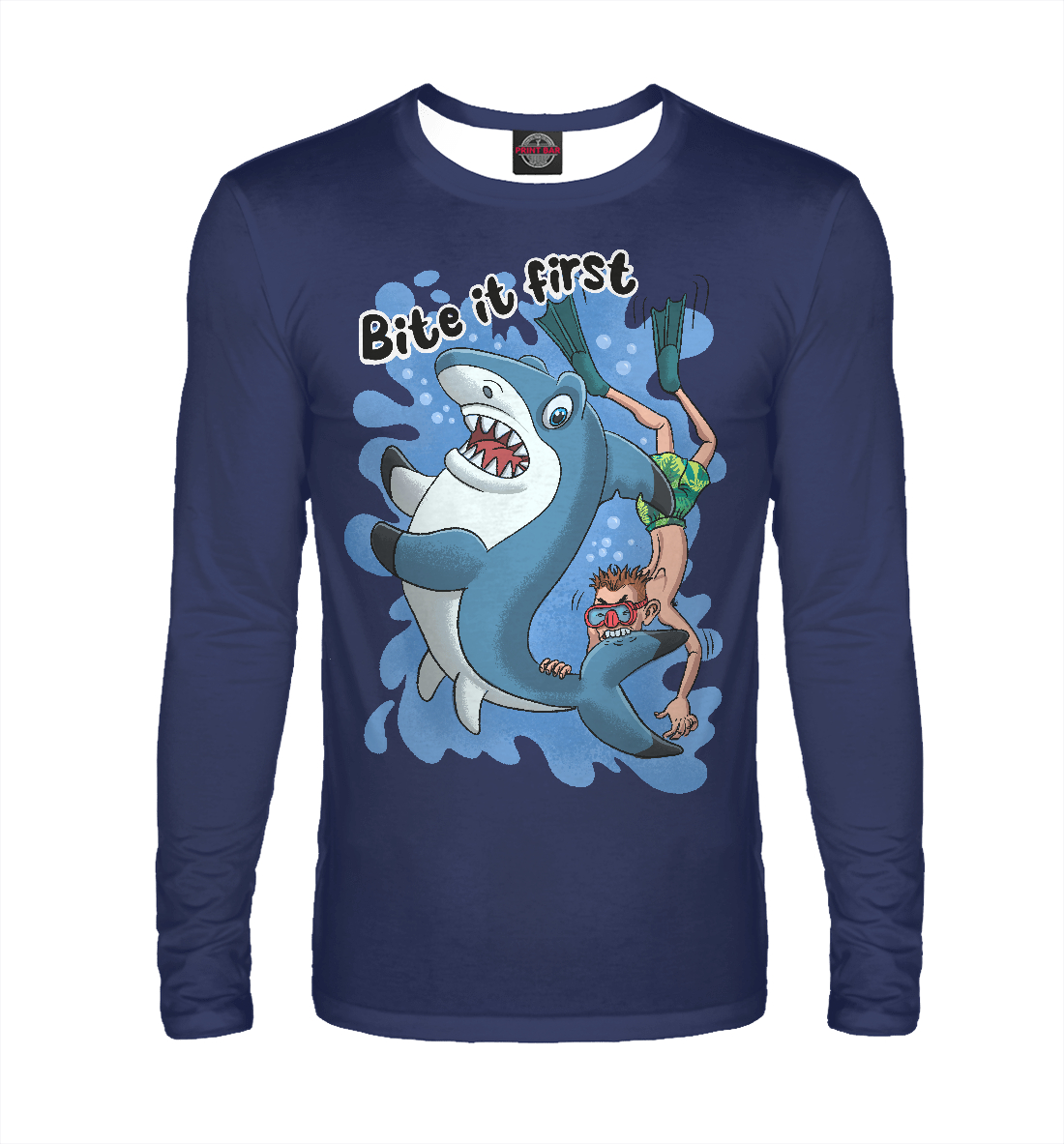 Мужской лонгслив с принтом «Дайвер кусает акулу»
