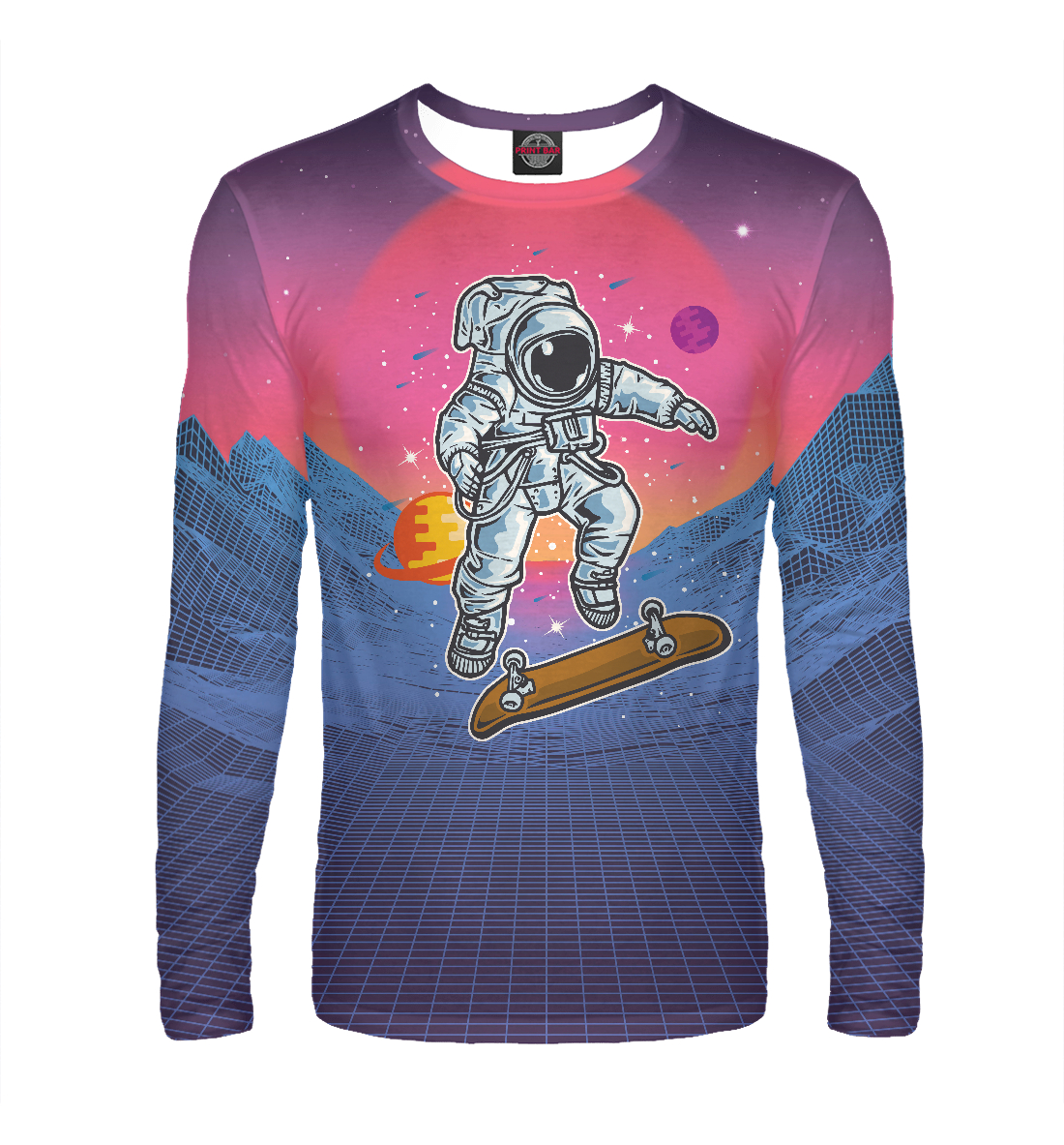 Мужской лонгслив с принтом «Космонавт прыгает на скейте»