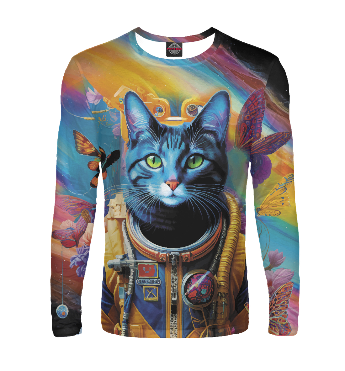 Мужской лонгслив с принтом «Котик бравый космонавт»