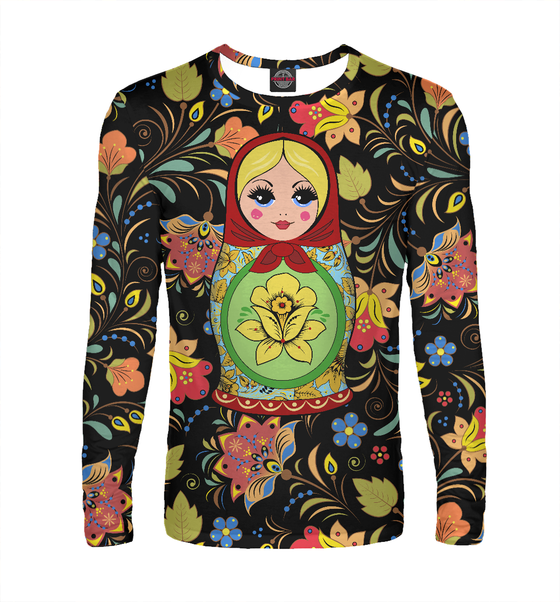 Мужской лонгслив с принтом «Русская матрёшка в хохломском узоре»