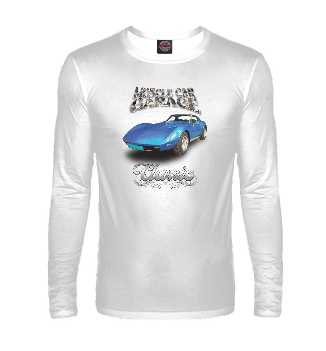 Мужской лонгслив с принтом «Синий масл-кар Corvette на белом»