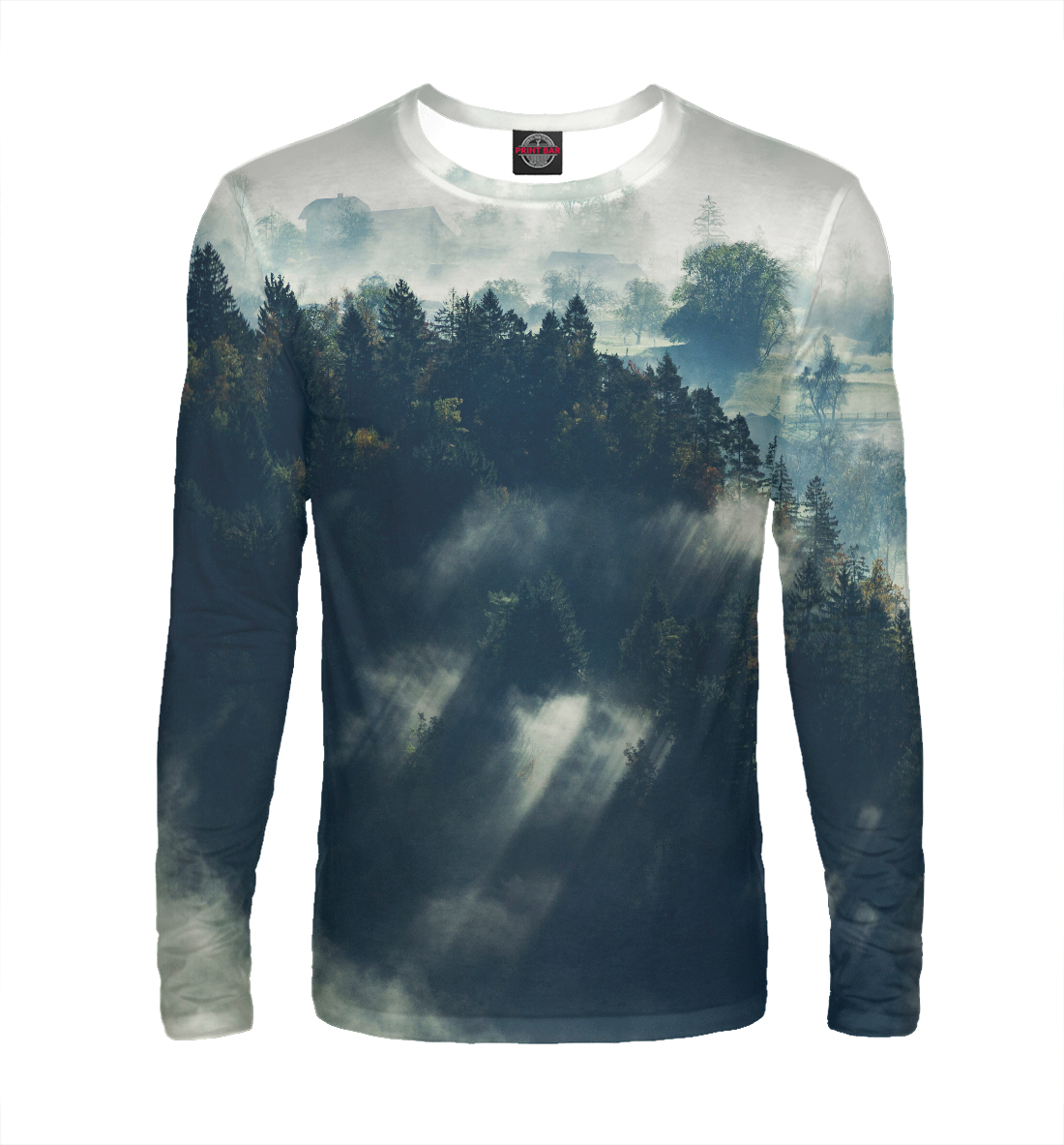 Мужской лонгслив с принтом «Туманный лес. Лучи солнца»