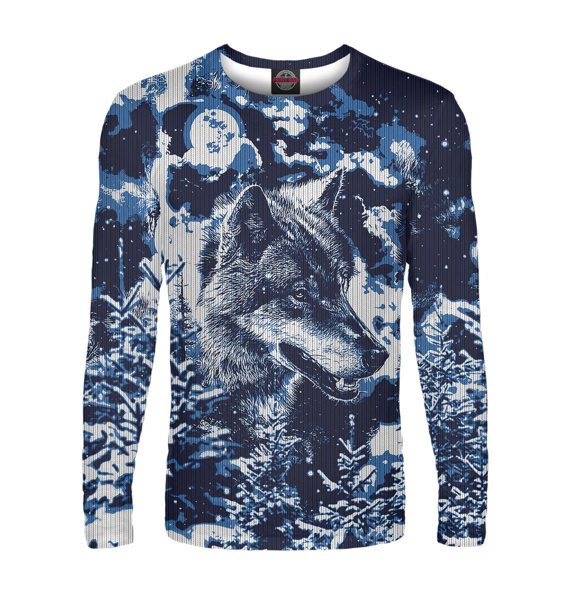 Мужской лонгслив с принтом «Свитер с волком в зимнем лесу»