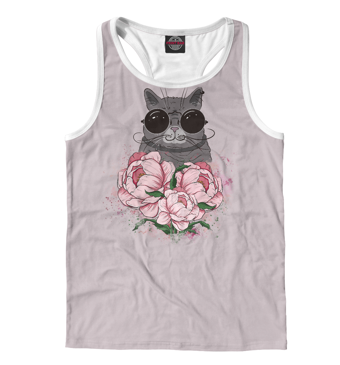 Мужская майка-борцовка с принтом «Кота очках с пионами»