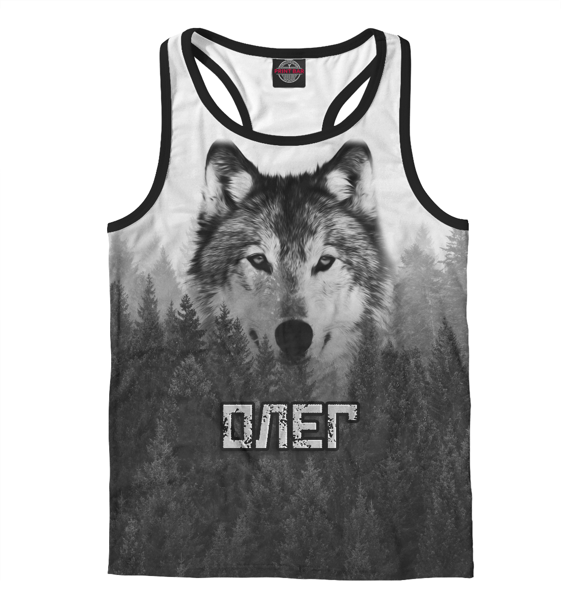 Мужская майка-борцовка с принтом «Волк над лесом - Олег»