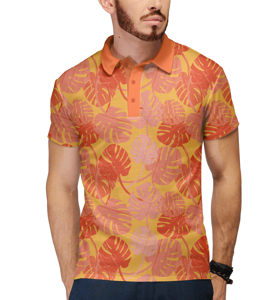 Мужское поло с принтом «Большие резные листья на оранжевом фоне»