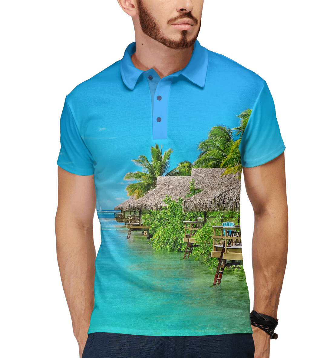 Мужское поло с принтом «Бунгало на берегу»