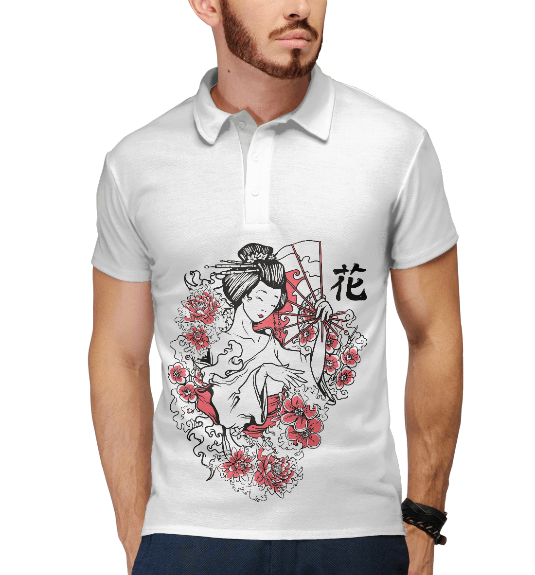Мужское поло с принтом «Гейша с веером»