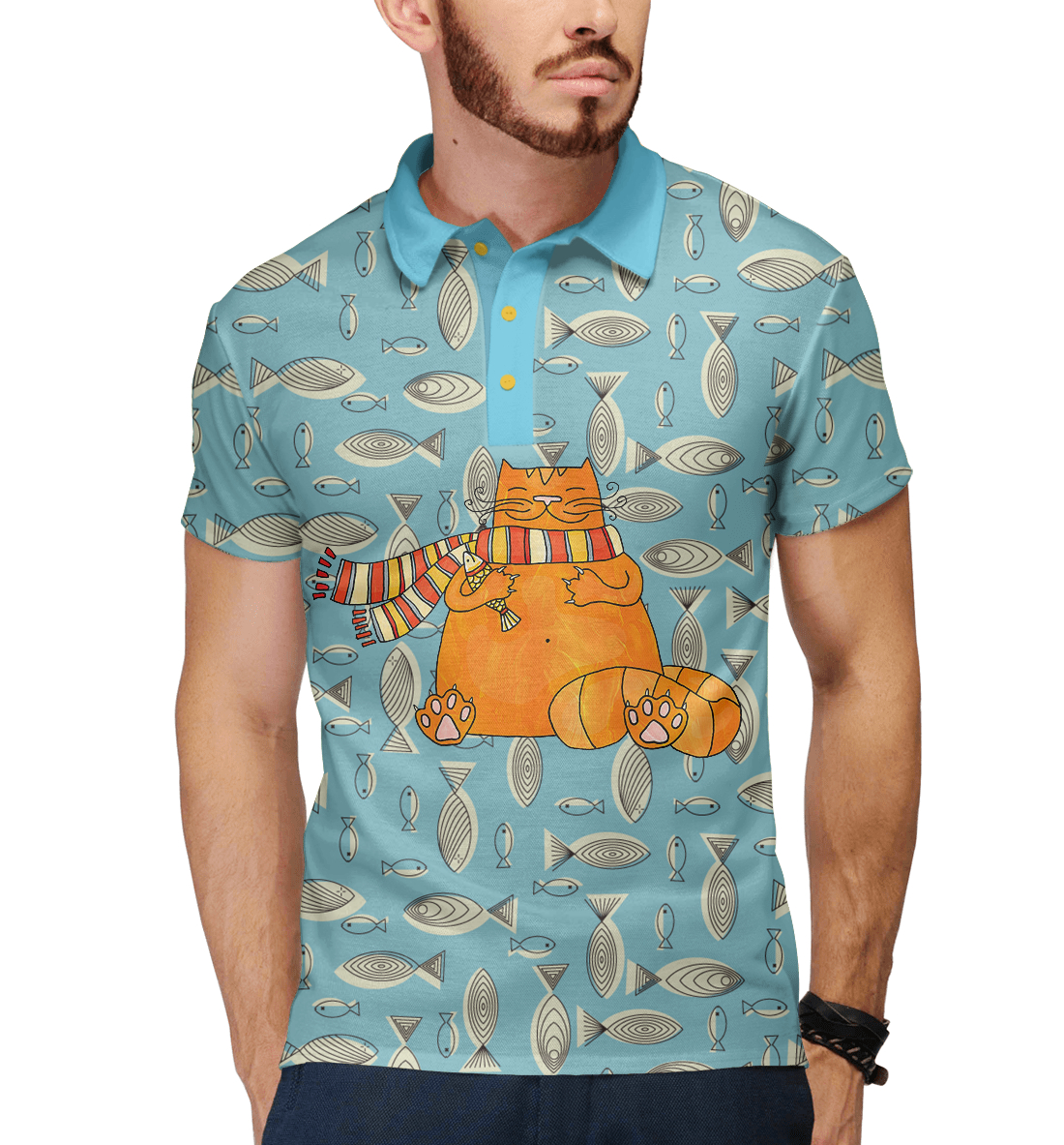 Мужское поло с принтом «Кот с рыбкой»