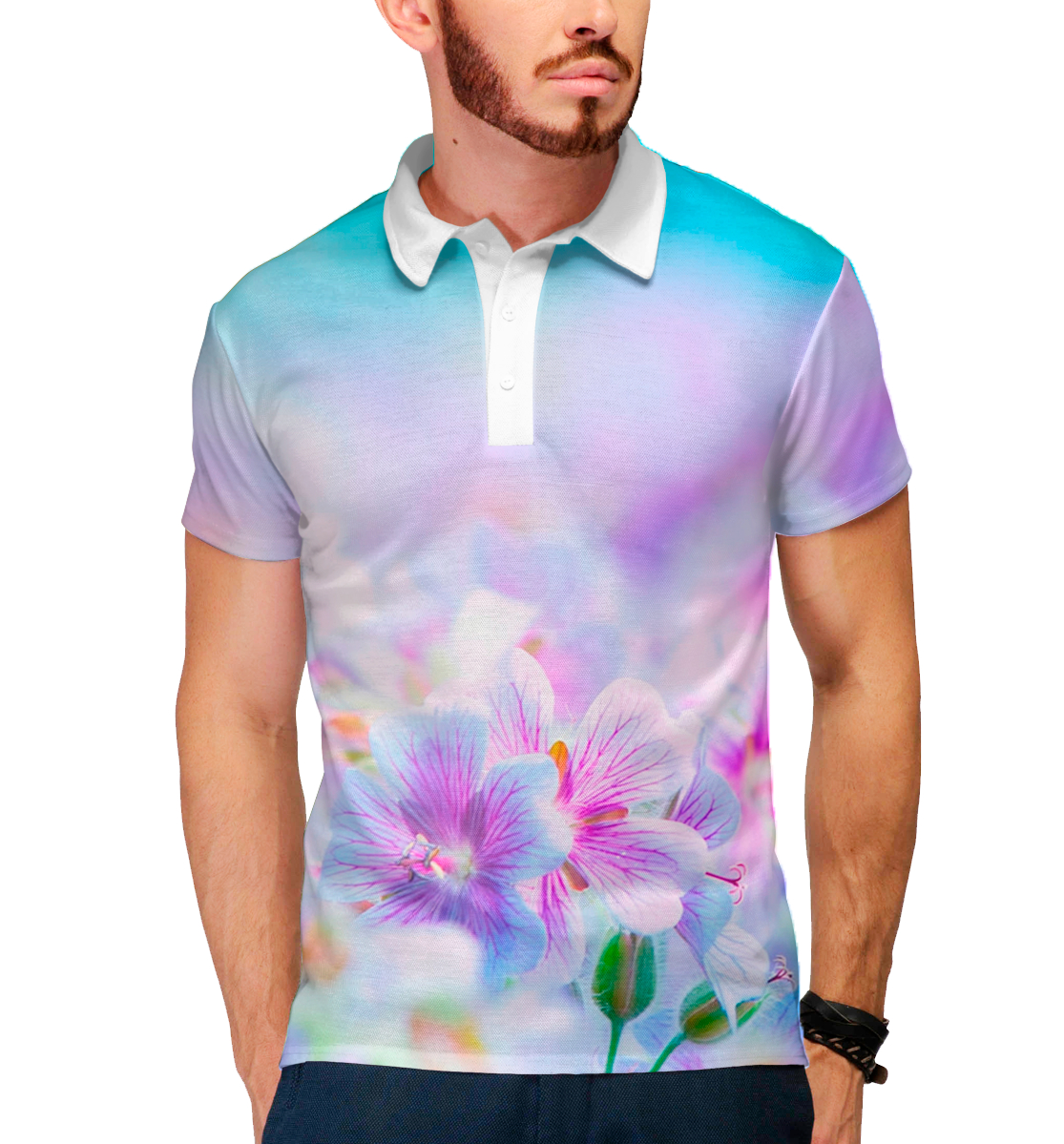 Мужское поло с принтом «Сиреневые цветочки»