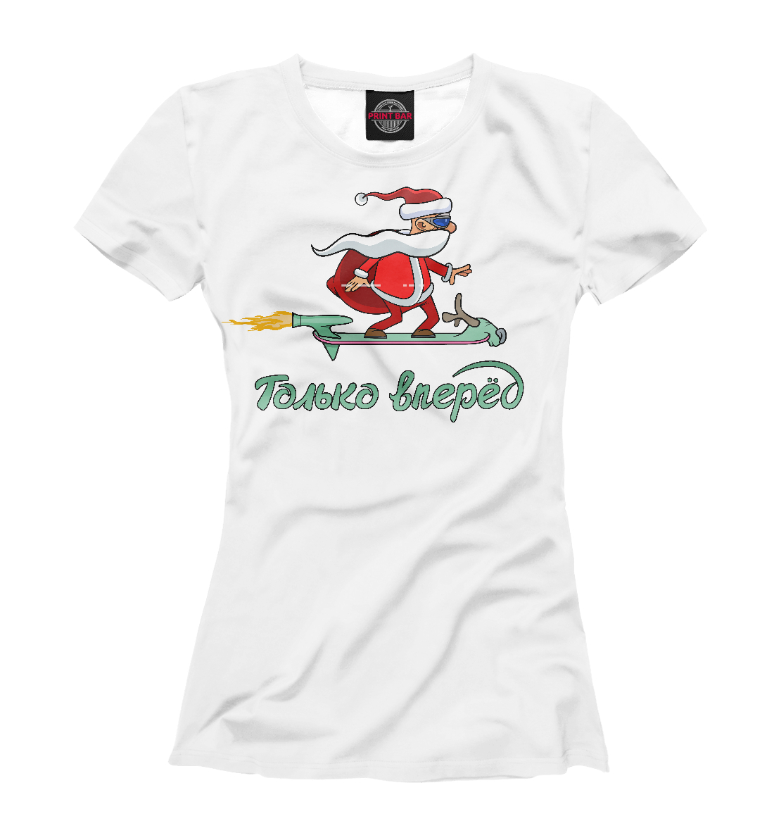 Женская футболка с принтом «Санта летит на скейтборде только вперед»