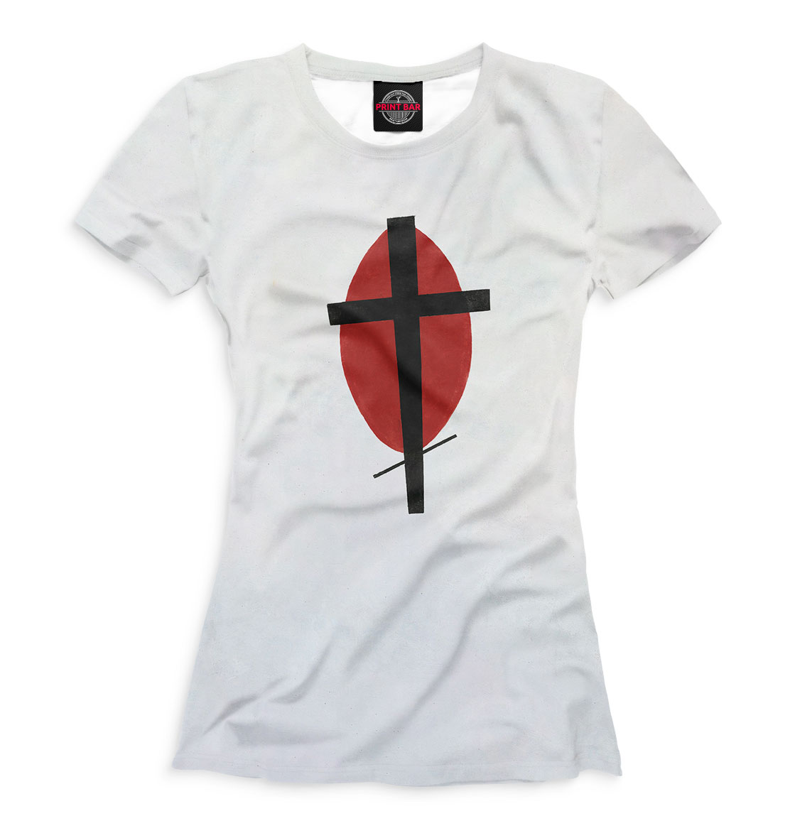 Женская футболка с принтом «Мистический супрематизм (Черный крест на красном овале)»