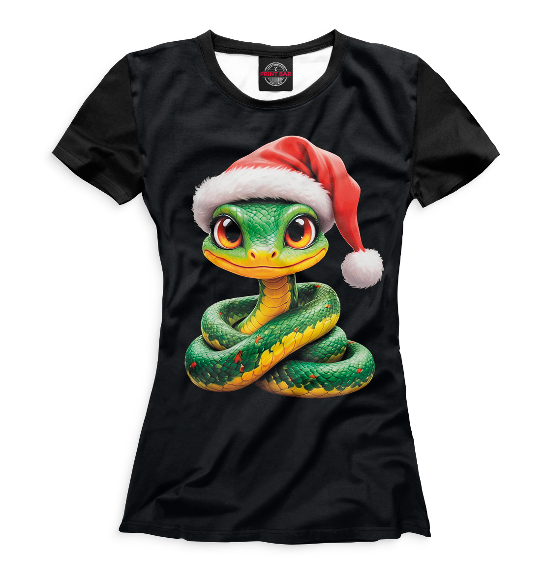 Женская футболка с принтом «Новогодняя змея на черном фоне»