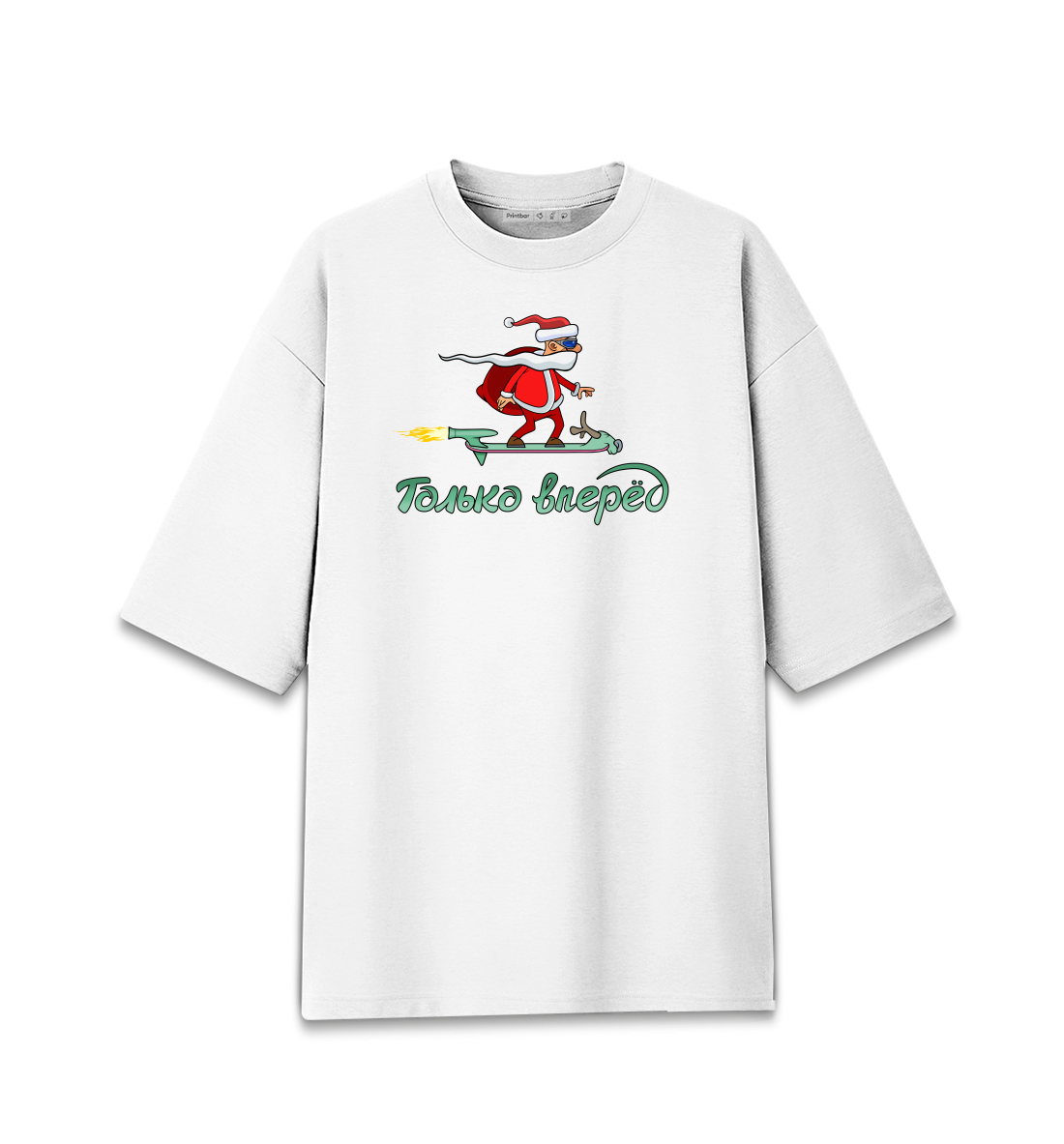 Женская футболка оверсайз Санта летит на скейтборде только вперед
