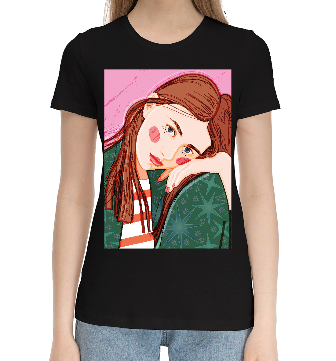 Женская хлопковая футболка Девушка в зелёном платье