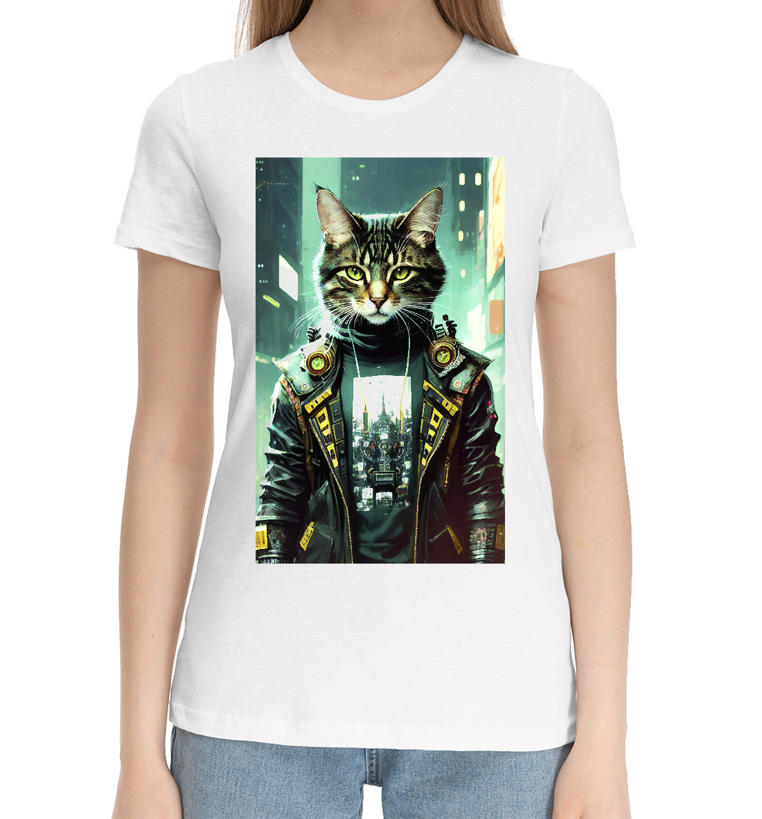 Женская хлопковая футболка Крутой котяра на фоне высоток