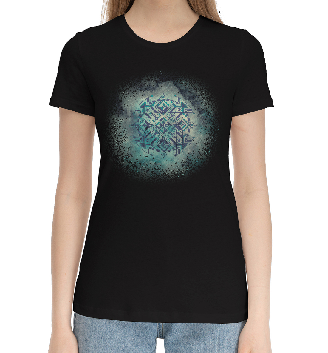 Женская хлопковая футболка Мандала спокойствия в космосе синяя