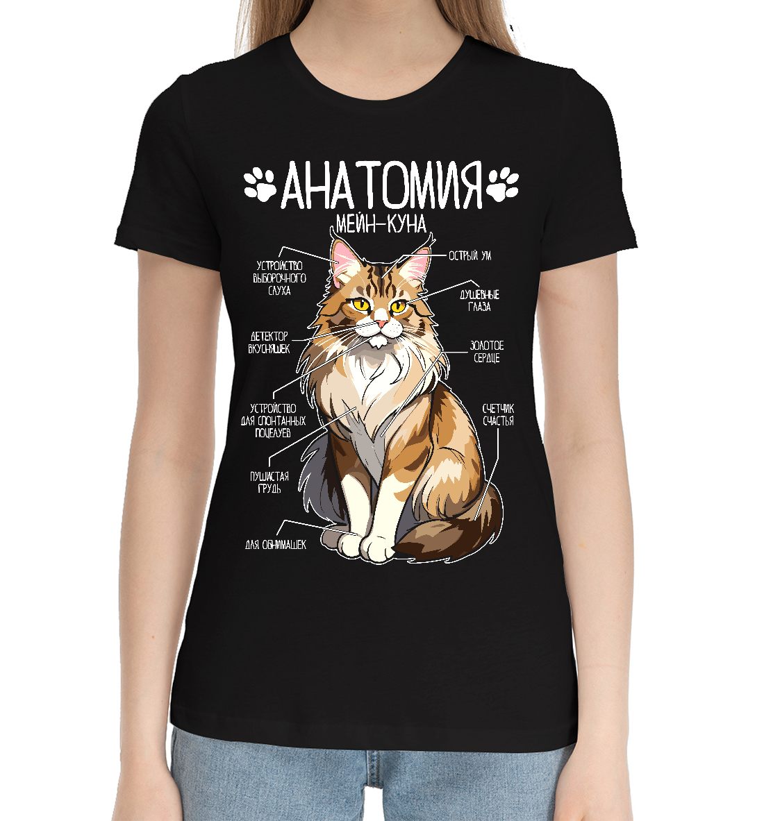 Женская хлопковая футболка Мейн-кун анатомия (черный фон)