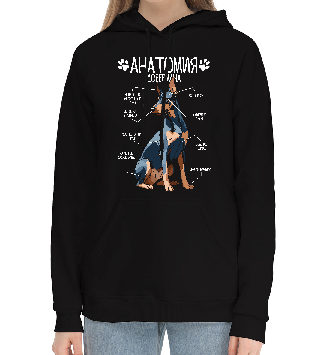 Женский хлопковый худи с принтом «Анатомия добермана, черный»