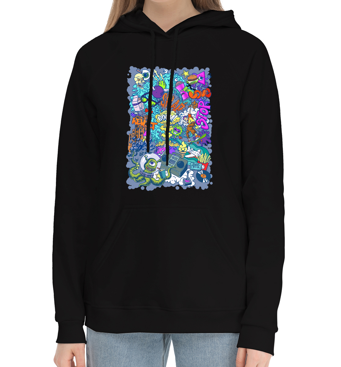 Женский хлопковый худи с принтом «Граффити с инопланетянином на синем фоне»