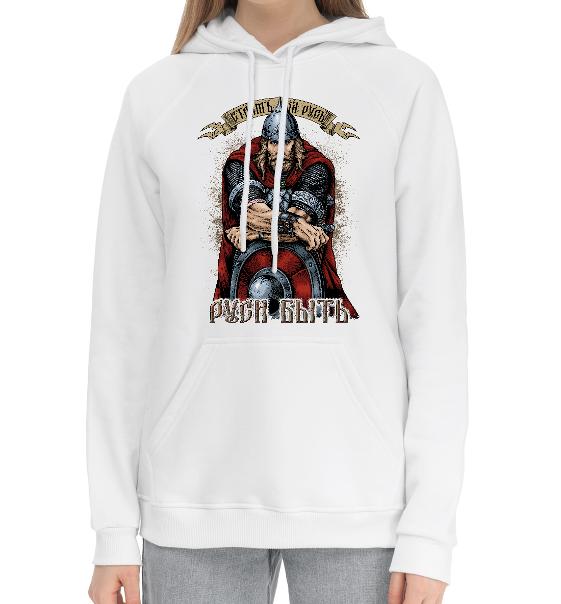 Женский хлопковый худи с принтом «Стоим за Русь (белый фон)»