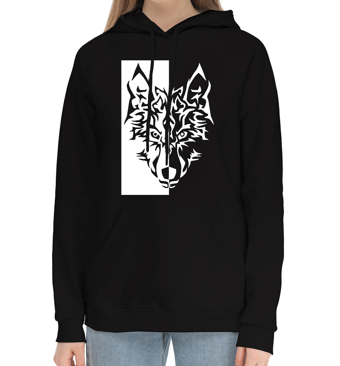 Женский хлопковый худи с принтом «Волк (чёрно-белый)»