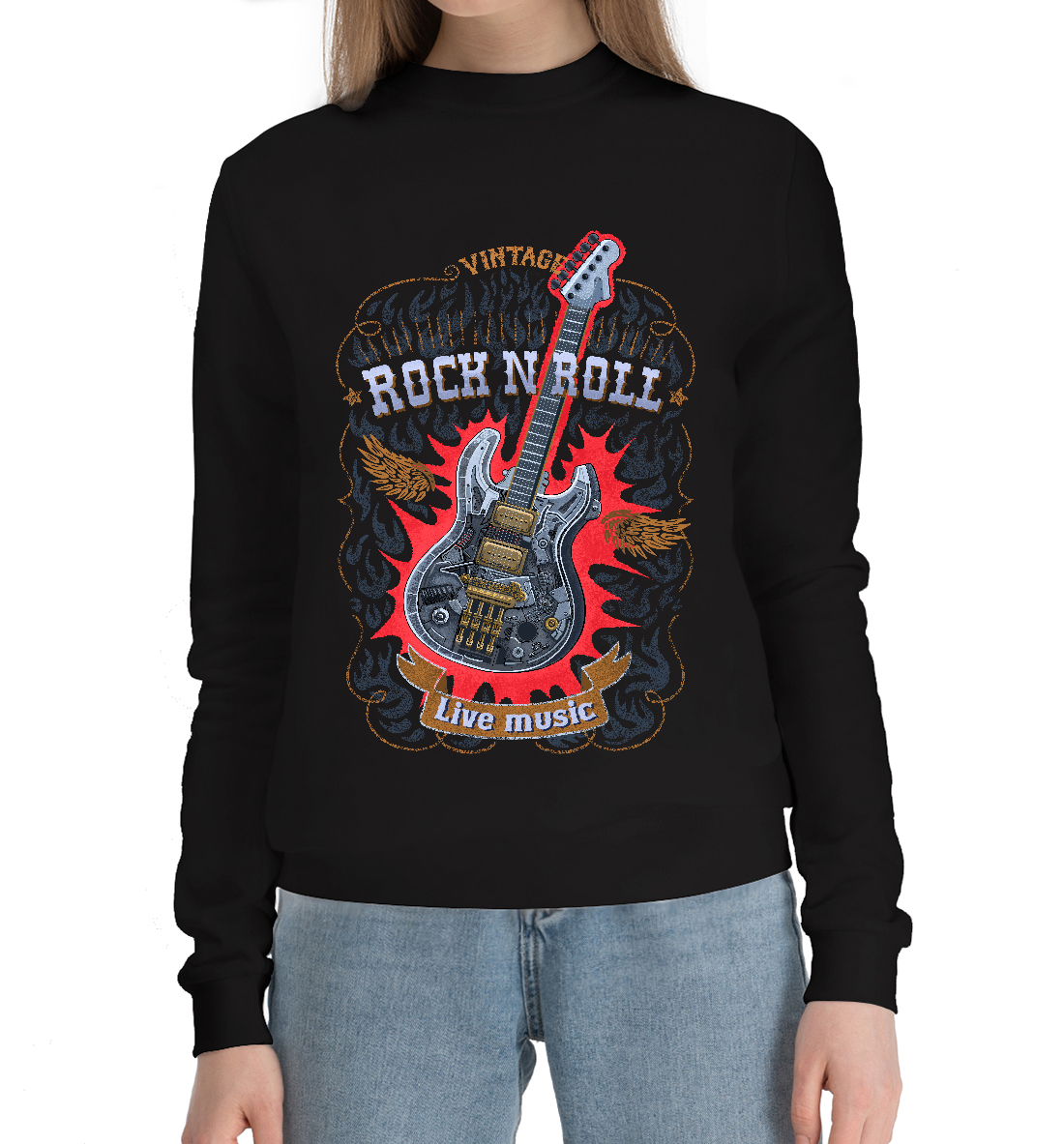 Женский хлопковый свитшот с принтом «Гитара стимпанк с надписью rock n roll»