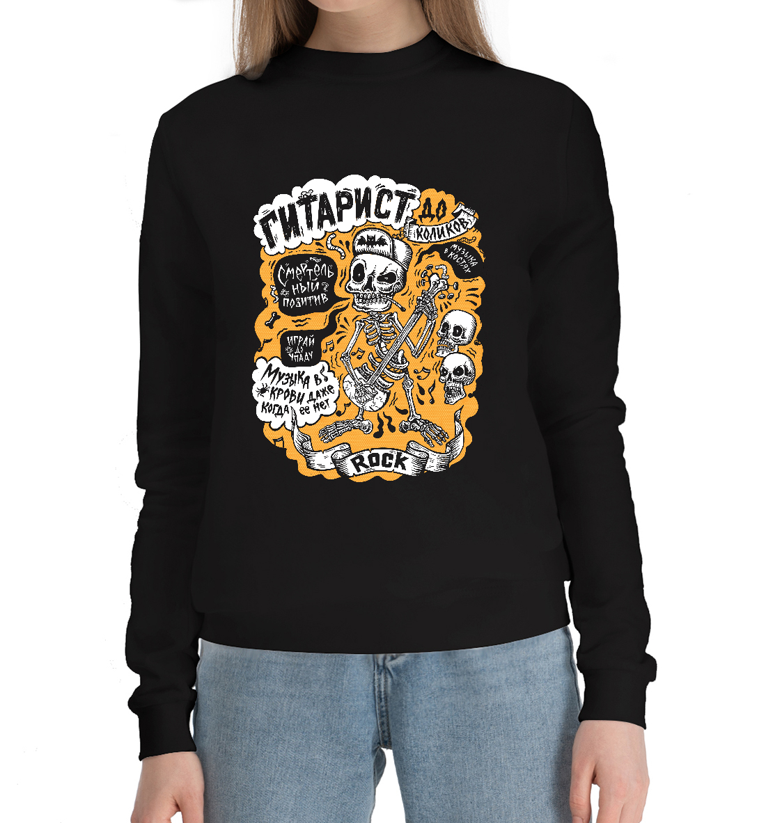 Женский хлопковый свитшот с принтом «Скелет гитарист с надписями»