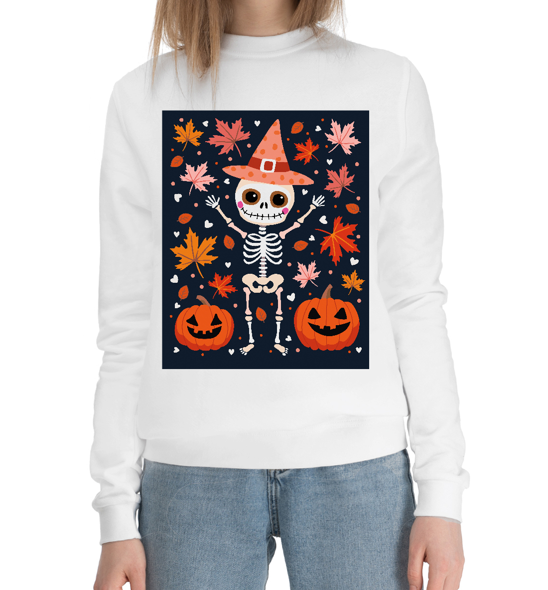 Женский хлопковый свитшот с принтом «Веселый скелет с тыквами»