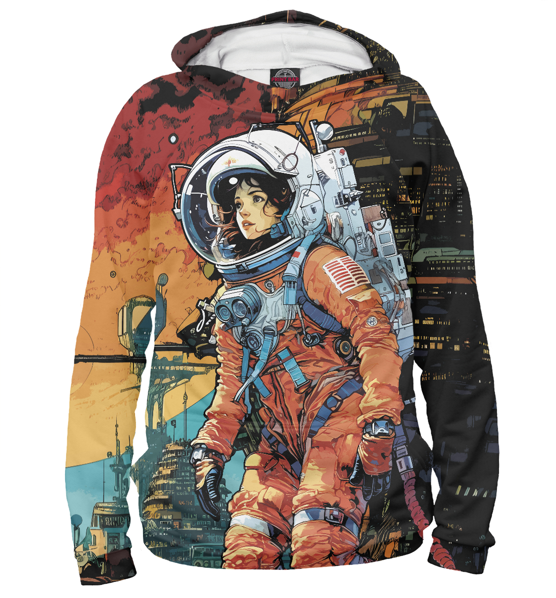 Женское худи с принтом «космонавт в фантастическом городе»
